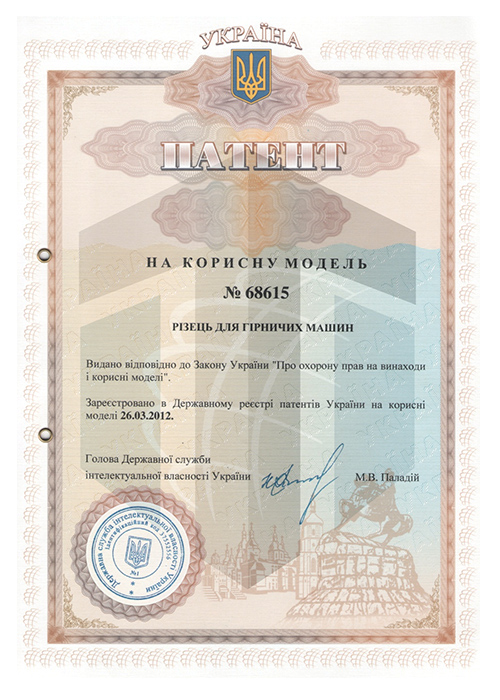 礦用截齒實(shí)用新型專利證書